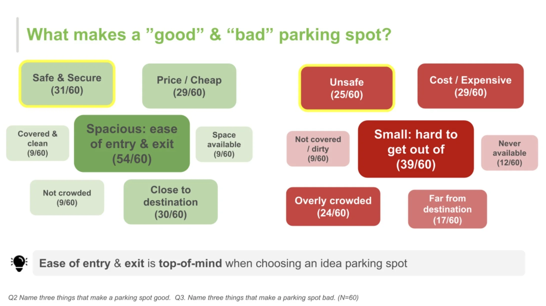 Stage 2 - Unmoderated Surveys (X=60): I launched a medium-sized survey, which confirmed Stage 1 findings in addition to providing additional insights around safety + car contents more specifically.